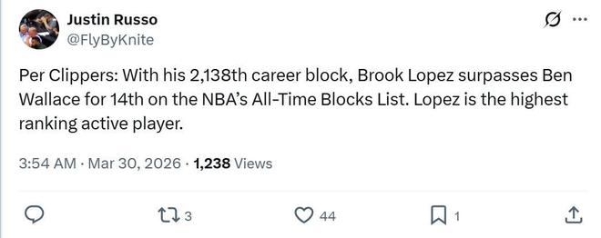 本場3中2,輕松拿下8分7板1助4斷2帽全能數據,生涯總蓋帽數來到2139個,超越本-華萊士獨居NBA歷史第14位。