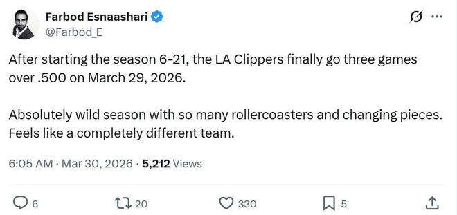 這一系列的喜訊也是這支快船隊在常規(guī)賽中后段傲人表現(xiàn)的縮影,正如船記Farbod Esnaashari所說,對于快船隊來說,這是一個堪稱過山車式瘋狂的賽季。