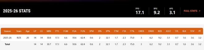 要知道楊瀚森本賽季代表混音出戰(zhàn)了14場比賽,場均30.8分鐘,拿到17.1分9.2籃板3.1助攻0.7搶斷1.6蓋帽,命中率62.4%,三分命中率32.1%,當(dāng)楊瀚森來G聯(lián)賽時他就是混音內(nèi)線的第一戰(zhàn)力,季后賽海報(bào)不該給他一席之地?