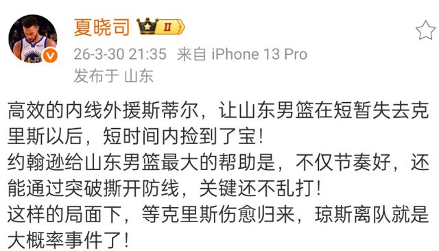 隨著斯蒂爾表現(xiàn)出色,山東男籃現(xiàn)在更換外援的順序發(fā)生了改變,瓊斯走的幾乎是沒有什么懸念,畢竟克里斯肯定是要回歸的,斯蒂爾的表現(xiàn)要比瓊斯好很多。
