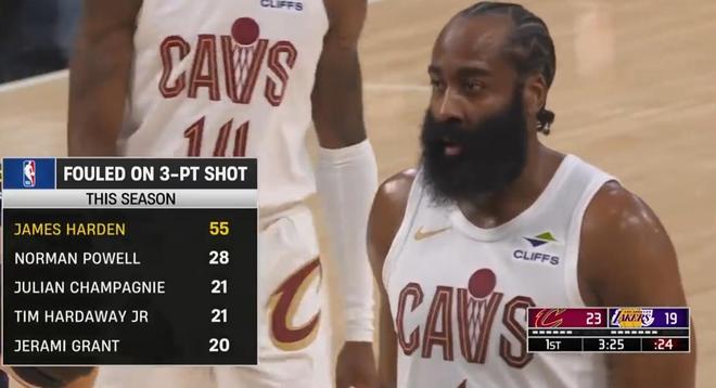 本賽季造三分犯規(guī)榜:哈登55次斷層領先,鮑威爾28次位居次席