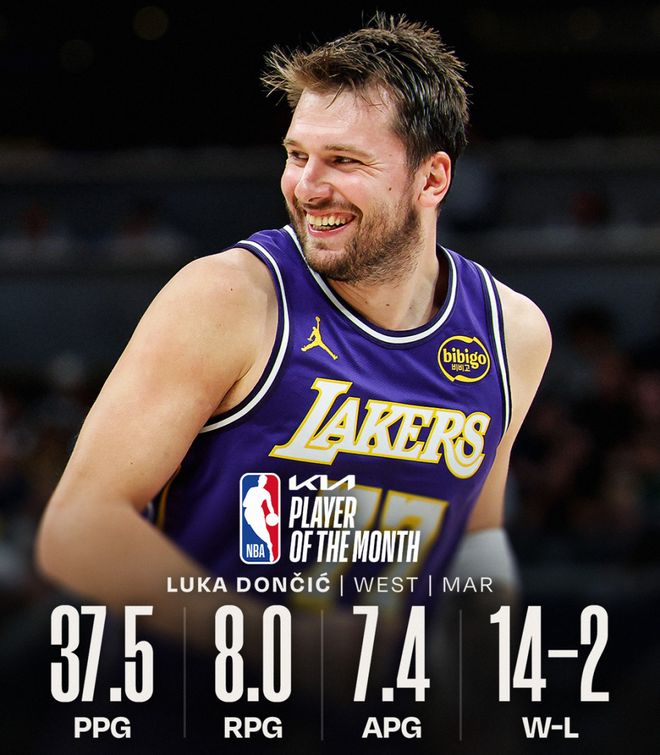北京時間4月3日,洛杉磯湖人隊后衛(wèi)盧卡-東契奇當選NBA三月西部月最佳球員。這是他本賽季第二次、職業(yè)生涯第七次獲得該月度榮譽。