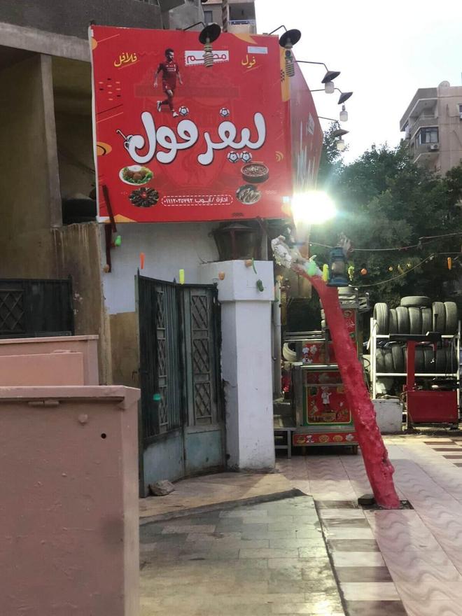 最能說明這一切的,是開羅納賽爾城一家售賣蠶豆泥和炸鷹嘴豆餅的小食店。這家店用阿拉伯語取名為“Liverfool”,巧妙融合了利物浦隊名與自家菜品,店招最上方便是薩拉赫的照片。