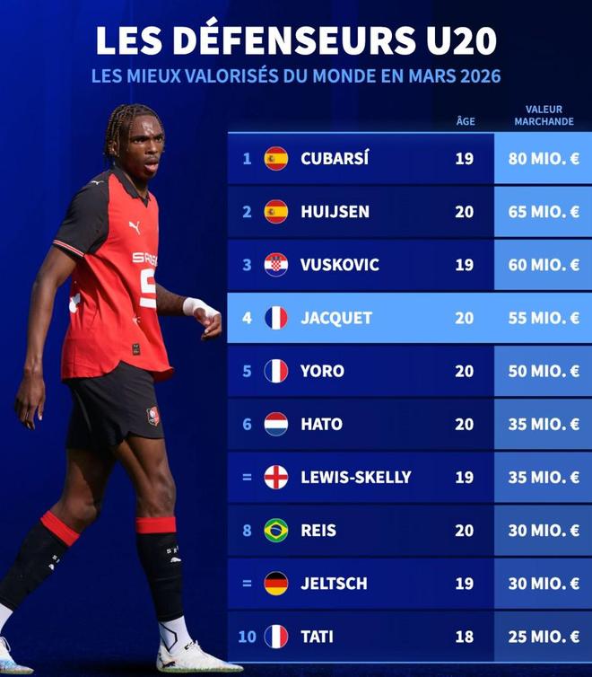 北京時(shí)間3月28日,在更新了法甲球員的身價(jià)之后,德轉(zhuǎn)列出了目前世界足壇身價(jià)排名前10的U20后衛(wèi),庫巴西以8000萬歐元高居第一,赫伊森6500萬歐元第二,此次更新身價(jià)暴漲3500萬歐元的杰里米-雅凱以5500萬歐元排名第四。