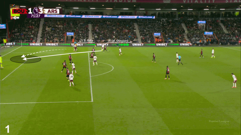 在他更為熟悉的右側(cè),他送出了一腳身后球,讓布卡約-薩卡去追。這腳傳球不僅洞穿了伯恩茅斯的后防線,還迫使對(duì)方門將與后衛(wèi)匆忙回防,導(dǎo)致球門——以及德克蘭-賴斯——暴露在空位之下,最終由賴斯完成破門。