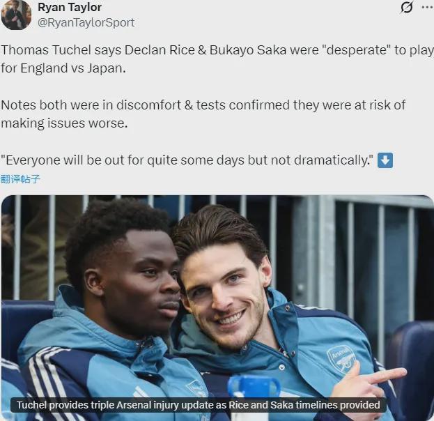關(guān)鍵就是這句“賴(lài)斯和薩卡在接受醫(yī)療評(píng)估時(shí)明顯身體不適”,也就是說(shuō),兩人可能在體測(cè)時(shí)均表明身體某些部位不舒服,而不是成像技術(shù)顯示某些部位受傷,換句話(huà)說(shuō),問(wèn)題不大。