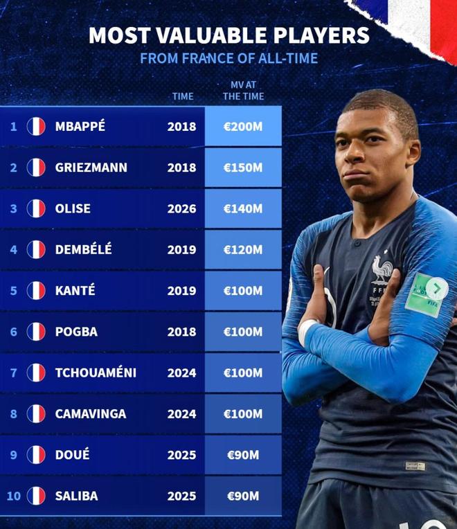 德轉(zhuǎn)法國球員歷史身價榜:姆巴佩2億第1,格子第2,奧利塞第3