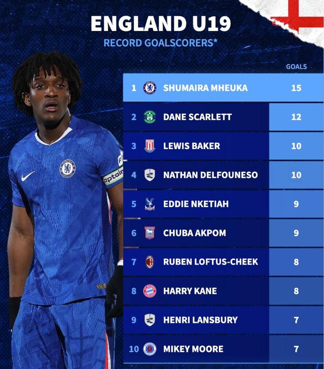 - 德轉(zhuǎn)列英格蘭U19代表隊(duì)歷史射手榜:切爾西小將姆厄卡15球第1