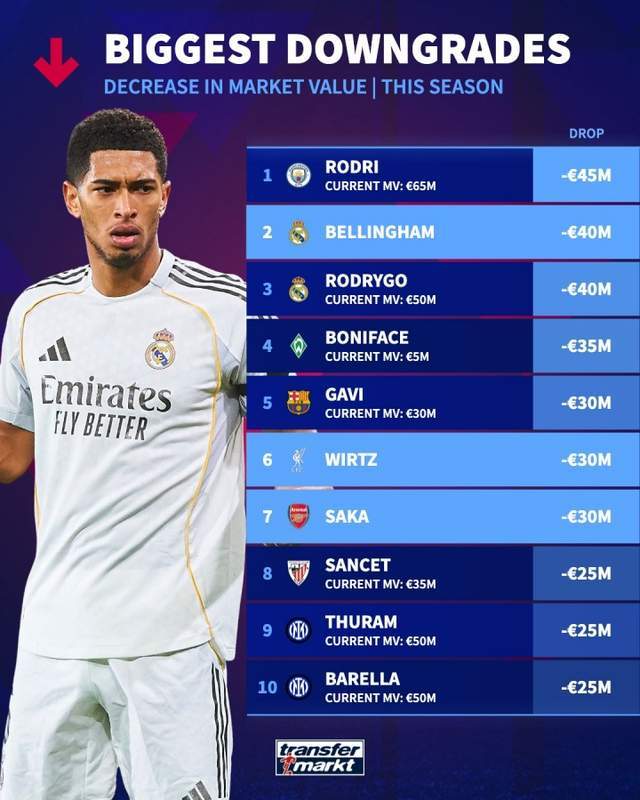德轉(zhuǎn)盤點(diǎn)了本賽季目前球員身價下跌榜,其中羅德里下降4500萬歐最多,貝林、羅德里戈下降4000萬歐。