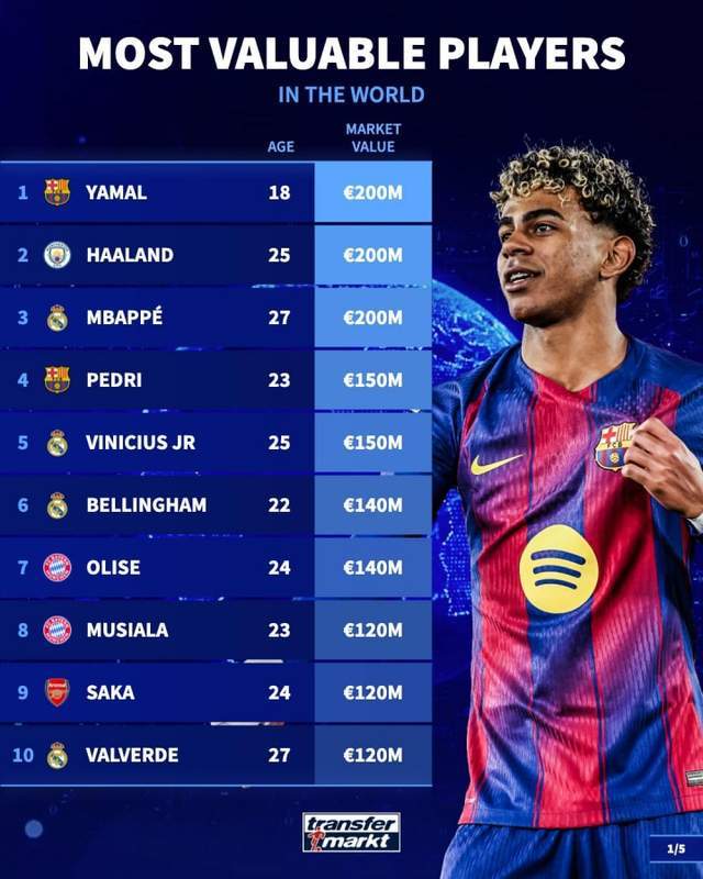 1-亞馬爾(巴薩),18歲,2億歐元